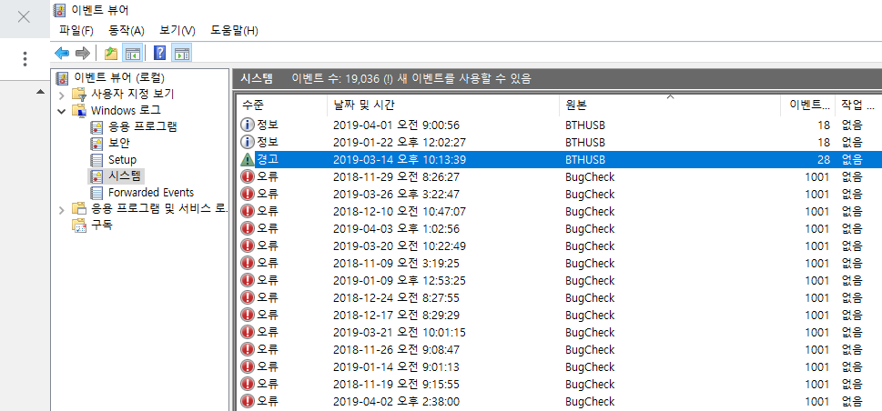좌측 메뉴에서 Windows 로그 - 시스템을 선택하면 중앙에 로그가 보이게 됩니다. 처음엔 시간순으로 정렬이 되어있어 최근에 블루스크린이 발생하였다면 쉽게 찾을 수 있습니다. 만약 이 여기서 원본을 선택하게 되면 종류별로 정렬이 되는데 BugCheck 부분을 확인하거나 [Ctrl + F]로도 검색이 가능합니다.