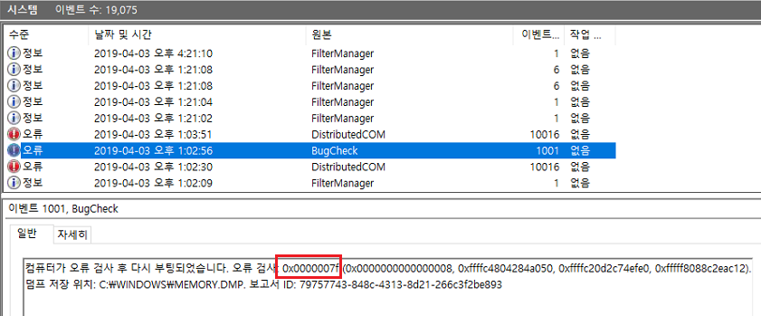 확인하고자 하는 항목을 선택하면 정보를 알 수 있습니다. 오류 검사 다음에 나오는 값이 오류 코드이며 제 PC에서 발생한 것은 0x0000007F 이네요.