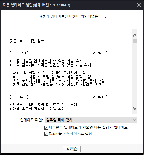 카카오 플레이어로 동영상을 보려고 할 때 업데이트 알림이 떠 바로 꺼줘야 하는게 너무 번거롭다고 생각했습니다. 꼭 필요한 경우라면 업데이트를 해야겠지만 대부분의 마이너 업그레이드는 일반 사용자들이 진행할 필요가 없는 경우가 대부분이기 때문이죠. 그리고 Daum을 시작페이지로 설정 함정카드도 있어서 체크 해제를 하고 진행해야 한다는 점