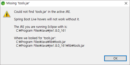 이클립스, sts 를 실행할 때 아래와 같이 Could not find tools.jar 에러가 나는 경우가 있습니다.