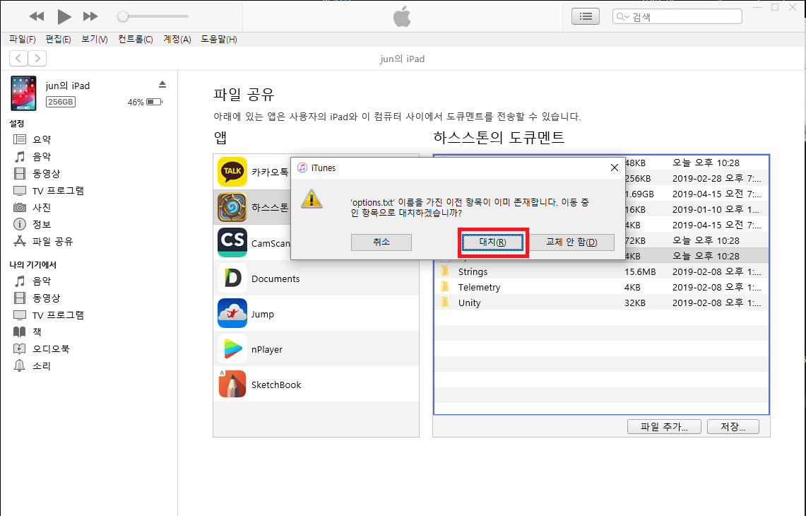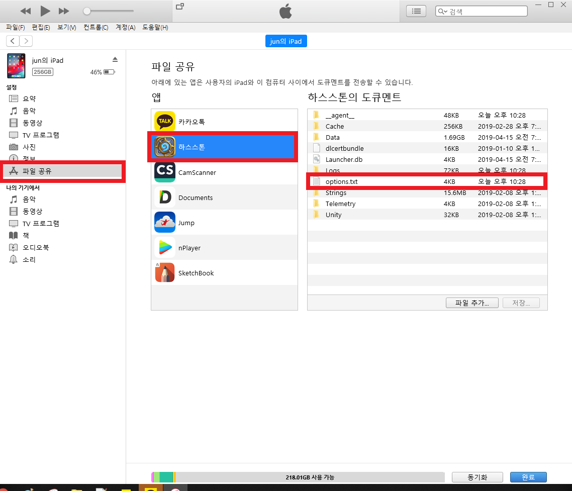아이튠즈에 연결한 후 좌측에서 파일 공유 - 하스스톤을 선택하여 options.txt 파일을 PC에 저장합니다. 드래그 앤 드랍으로 이동 가능!