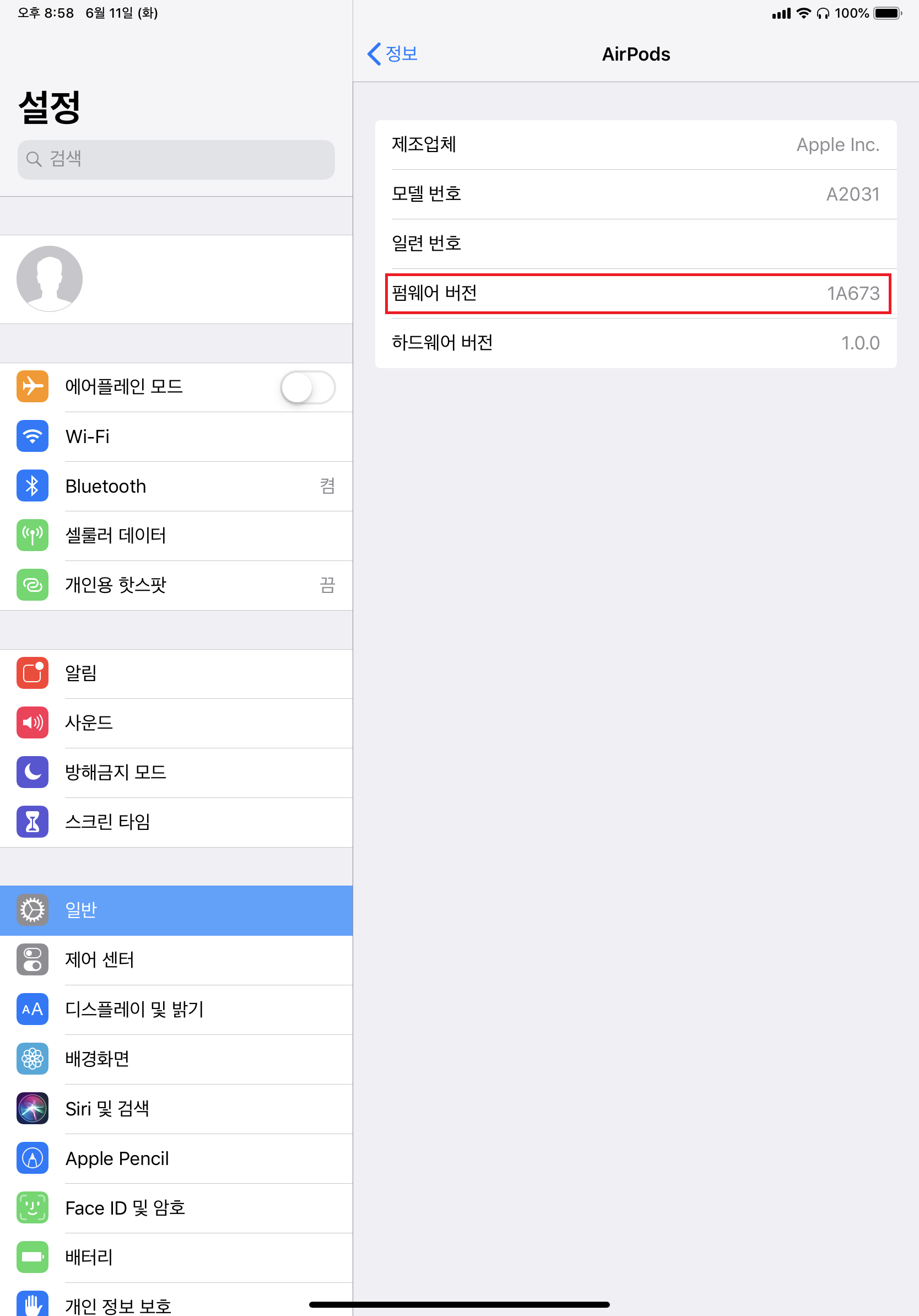 제 에어팟2의 경우 현재 1A673 버전이 적용되어 있는 상태를 확인할 수 있습니다.
