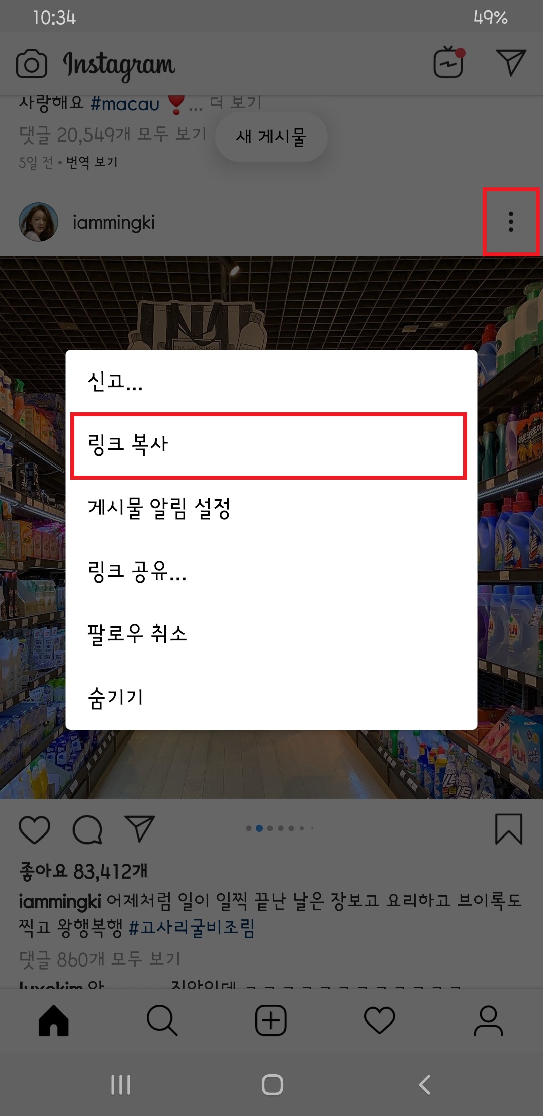 - 인스타그램 어플일 때 다운받고 싶은 영상이 있으면 우측 상단 ⋮ 를 터치하여 링크복사를 합니다.