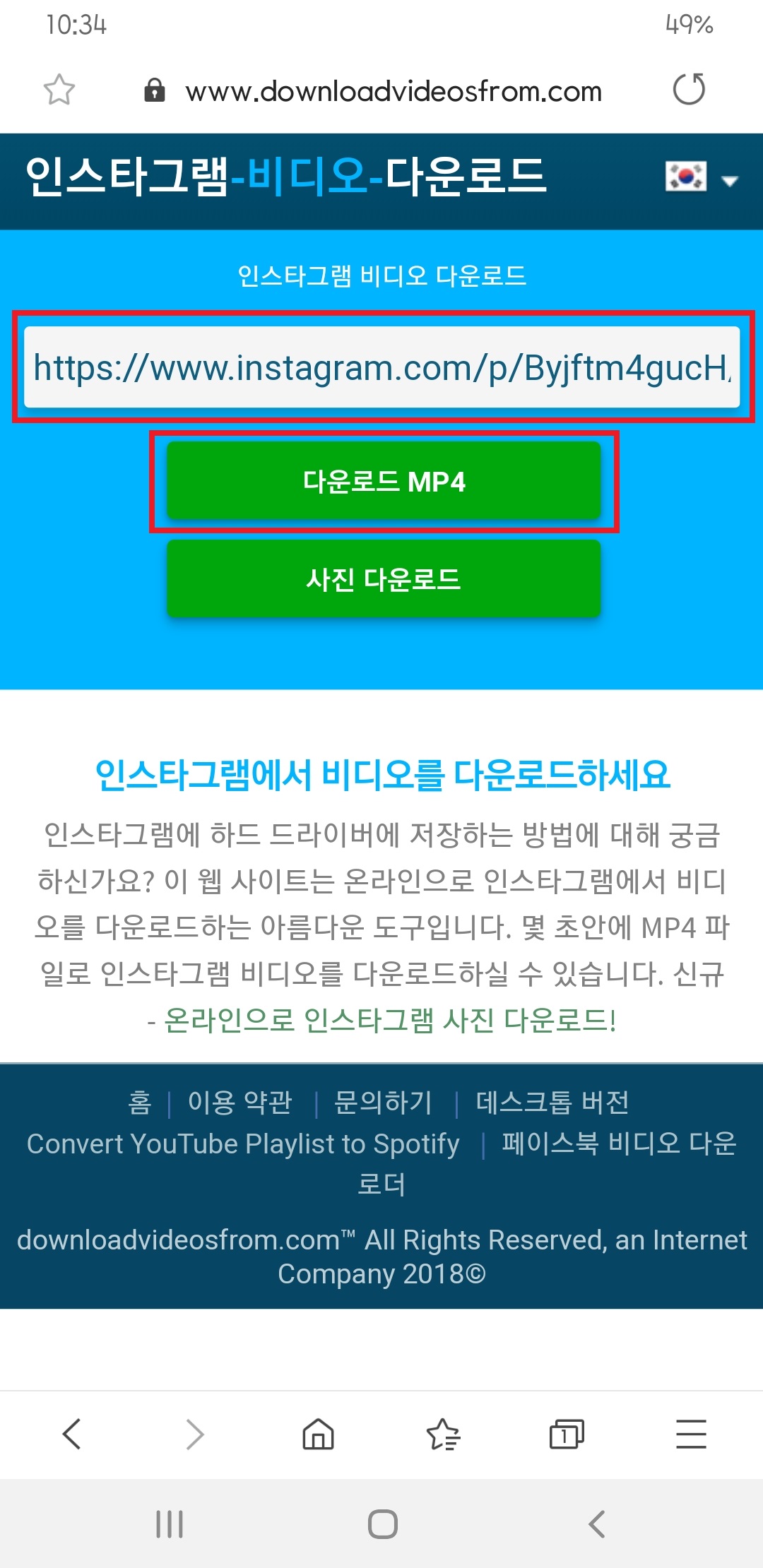 웹 브라우저로 위 링크에 들어가서 아까 인스타그램에서 복사한 주소를 붙여넣은 후 다운로드 MP4라는 버튼을 클릭하면 됩니다.