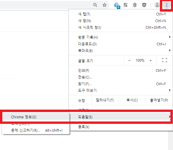 사용중인 크롬 브라우저 버전 확인 방법은 우측 상단 ⋮ 를 클릭한 뒤 도움말 - Chrome 정보에서 바로 확인가능합니다.