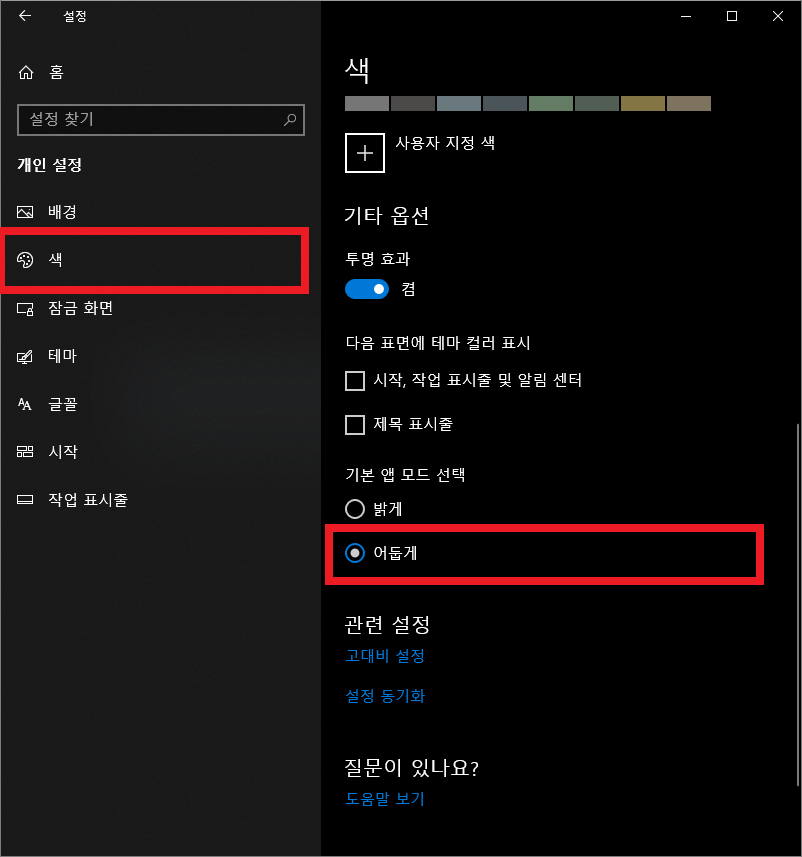 좌측 메뉴 트리에서 색을 선택한 후, 기본 앱 모드 선택에서 어둡게를 클릭하면 바로 적용됩니다. 적용이 되면 아래 사진처럼 윈도우 설정 화면도 검정색으로 변하게 됩니다.