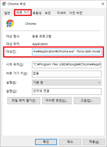 바로 가기 탭에 대상 부분 마지막에 -force-dark-mode를 추가한 후 확인을 누릅니다.