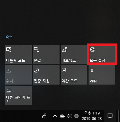 윈도우10 우측 하단 메뉴 - 모든 설정에 들어갑니다.