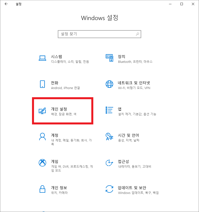 개인설정을 클릭합니다.