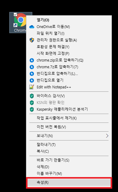크롬 아이콘을 우측 마우스 클릭한 후, 속성을 클릭합니다.