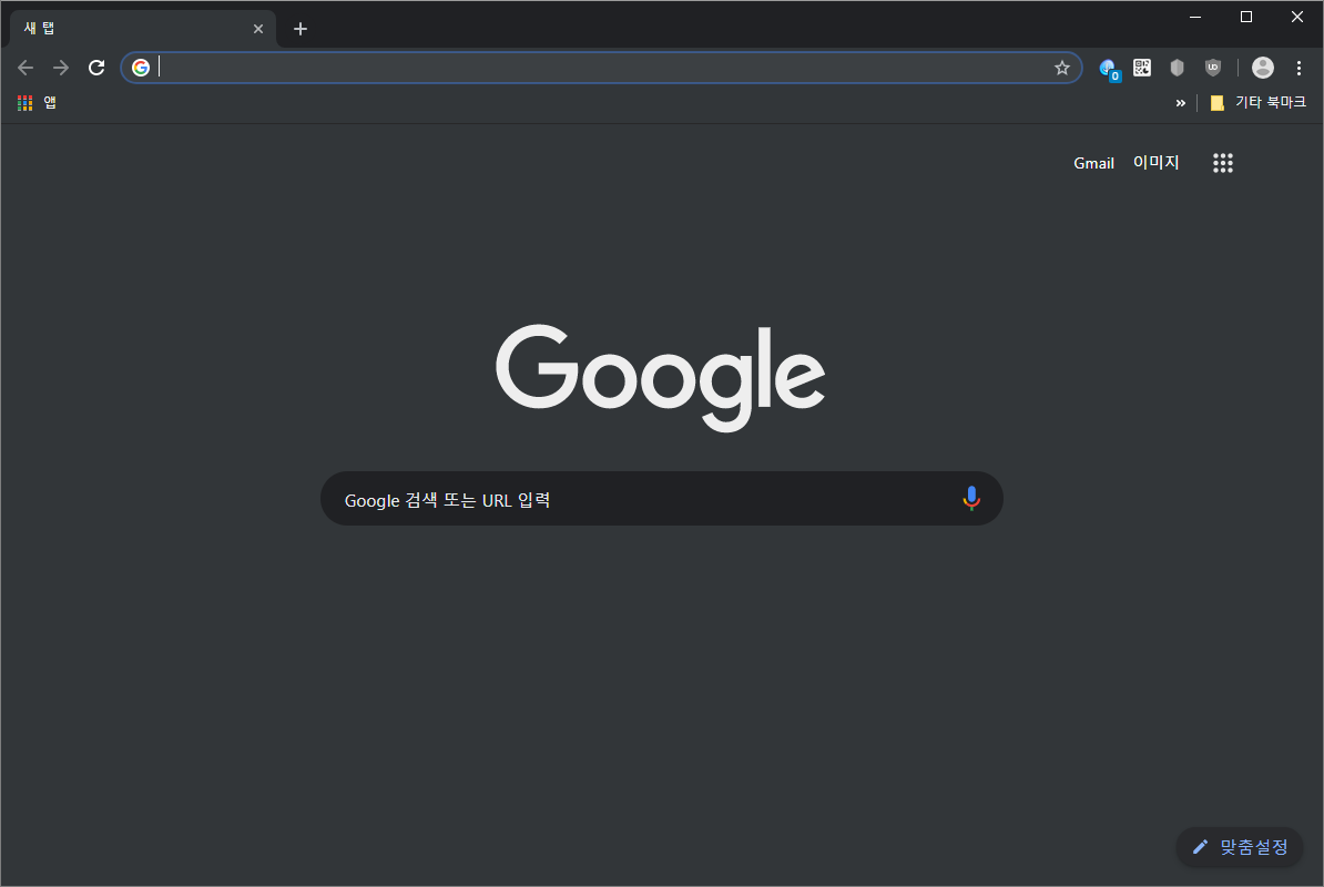 다크모드가 적용된 크롬 브라우저는 아래 모습입니다. 외부 탭 부분, 설정 부분만 검정색 테마가 적용된다고 보면 됩니다. (내부 웹 페이지는 기존 스타일 유지)
