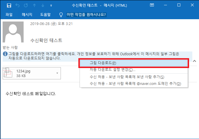 만약에 '그림을 다운로드 하려면 여기를 클릭하세요.' 부분을 클릭 - 그림 다운로드를 하면 수신확인용 이미지를 호출하게 되면서 상대방이 수신확인을 하였는지 알 수 있게 됩니다.