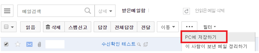 메일 수신하는 계정에서 좌측 체크박스를 한 후 상단 ··· 을 클릭하여 PC에 저장하기를 선택하면 해당 메일의 eml 파일을 다운받을 수 있습니다. 이 때 제목을 바로 클릭하면 메일을 읽게 되니 주의해야 합니다.