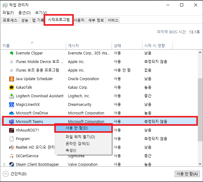 작업 관리자 - 시작프로그램 탭에서 Microsoft Teams 항목을 찾아 우클릭 사용 안 함을 선택하면 설정 끝입니다. 이후 재부팅 부터는 이 프로그램에 대해 자동으로 시작되지 않게 됩니다.