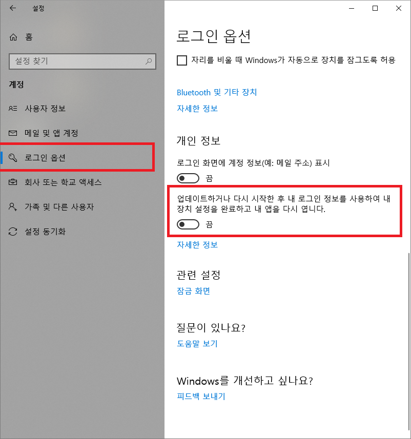 좌측에서 로그인 옵션을 선택한 후 스크롤을 내려보면 '업데이트하거나 다시 시작한 후 내 로그인 정보를 사용하여 내 장치 설정을 완료하고 내 앱을 다시 엽니다.' 부분을 끔으로 변경합니다.
