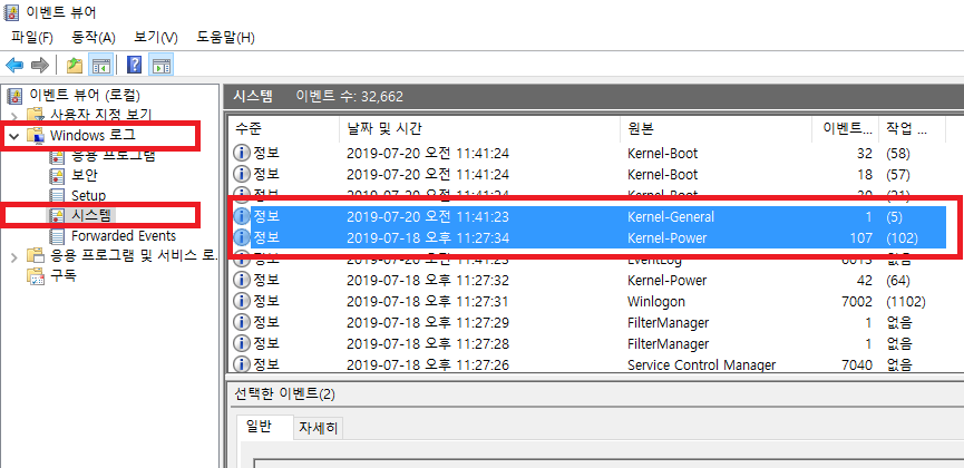 리스트가 나오면 원본 부분에 Kernel-Power, Kernel-General 부분을 보면 됩니다.