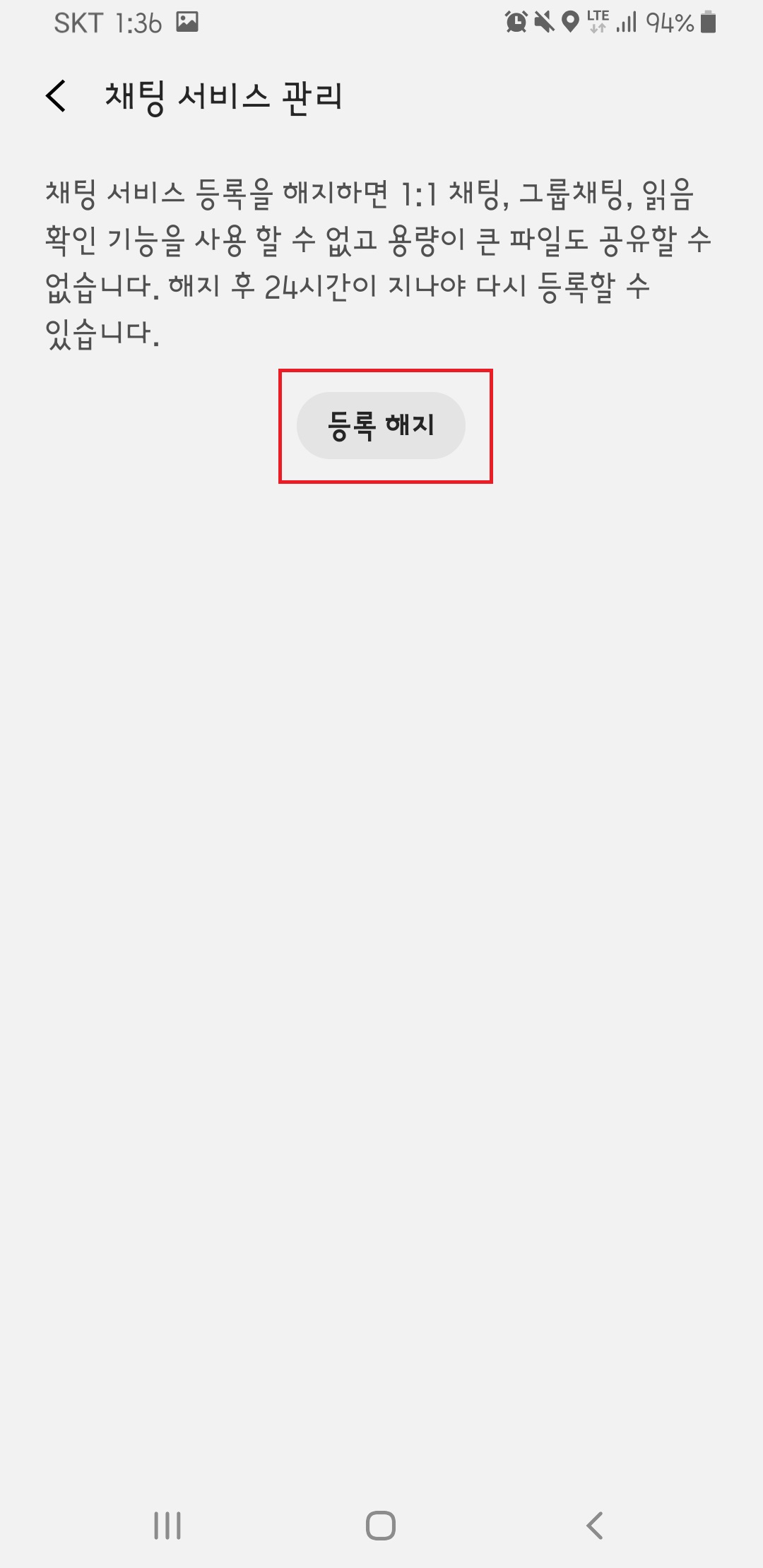 해지할 경우 1:1채팅, 그룹채팅, 읽음 확인 기능을 사용할 수 없다고 안내해 줍니다.
