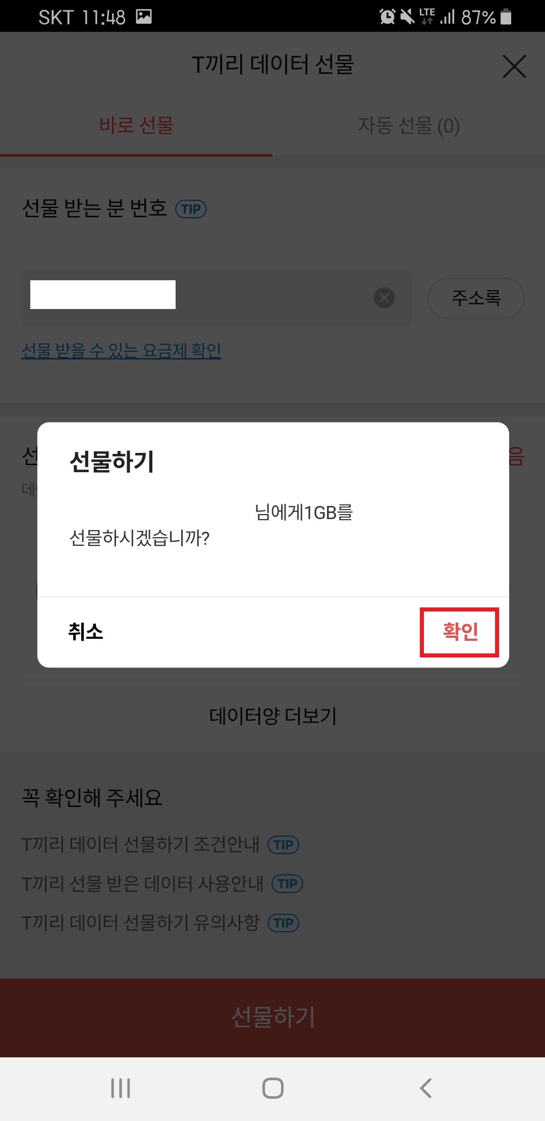 SKT 데이터 선물 보내는 방법
