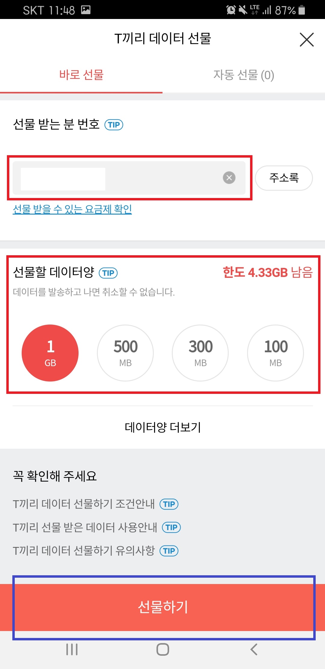 T끼리 데이터 선물 메뉴에서 선물 받는 사람의 번호, 보낼 데이터양을 선택한 후 선물하기 버튼을 누릅니다.