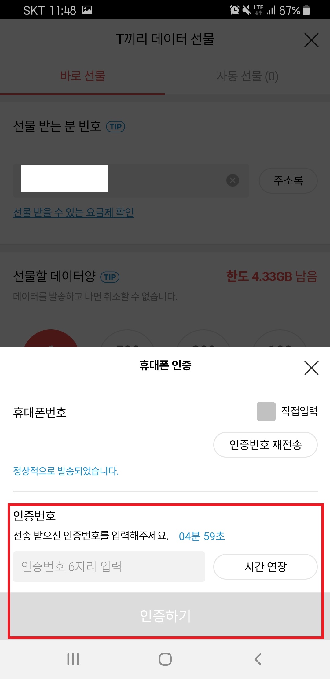 매번 선물을 보낼 때 마다 문자 인증을 거쳐야 합니다. 인증번호를 받고 인증하기를 클릭하면 전송이 됩니다.