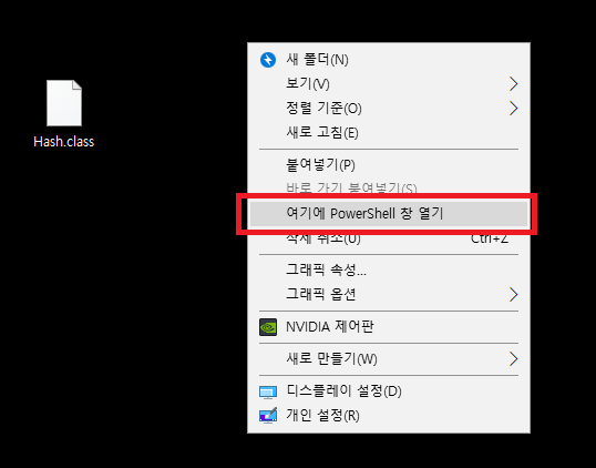윈도우, 리눅스 모두 방법은 동일합니다. 확인하고자 할 class 파일의 경로로 이동하여 윈도우의 경우 [Shift + 마우스 우클릭] 한 후 여기에 PowerShell 창 열기 또는 명령프롬프트 열기를 선택합니다.