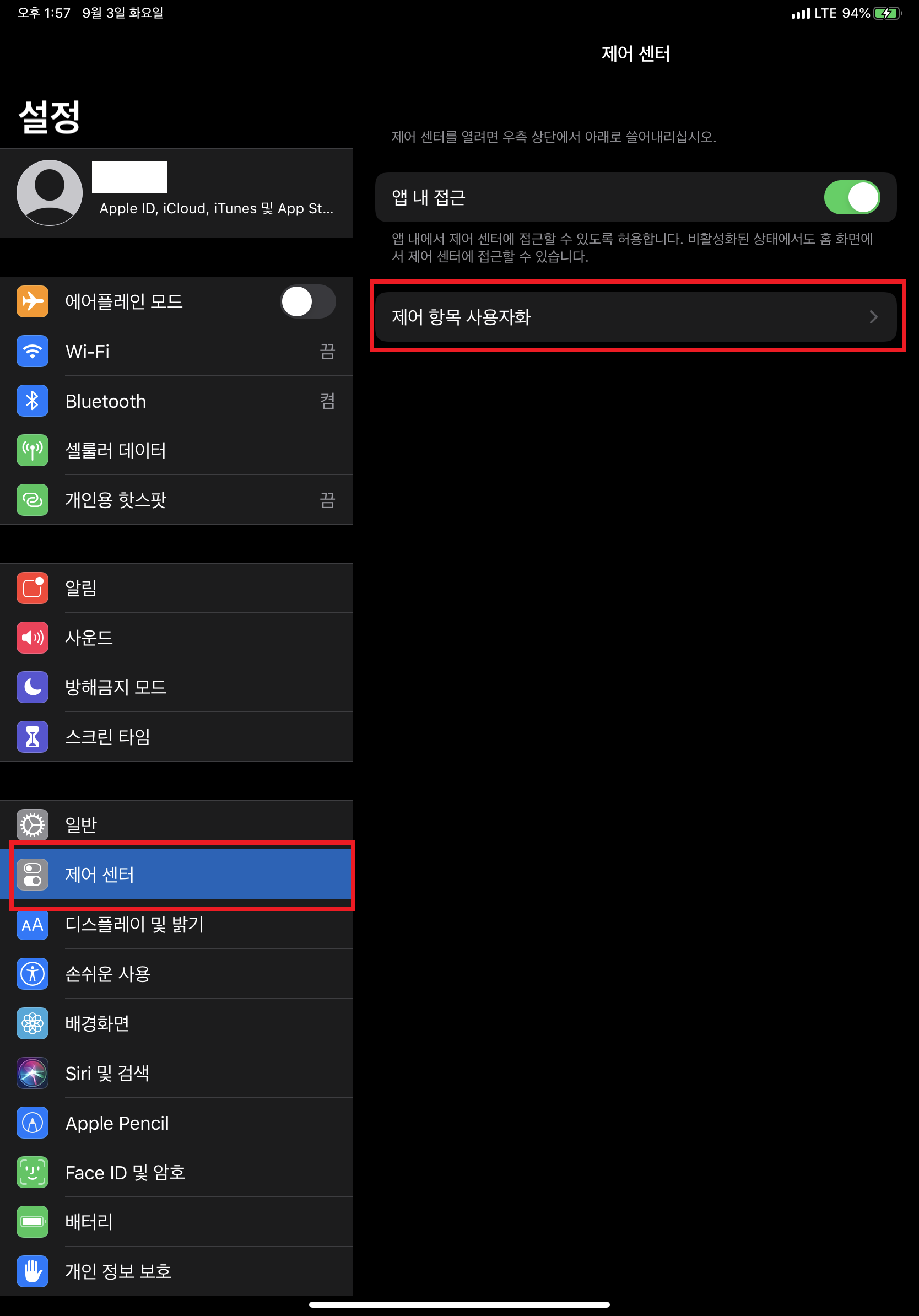 설정에 들어가 제어 센터 - 제어 항목 사용자화를 선택합니다.