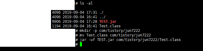 - 2. jar -uf TEST.jar com/tistory/jun7222/Test.class를 입력하면 해당 파일이 교체가 됩니다.
