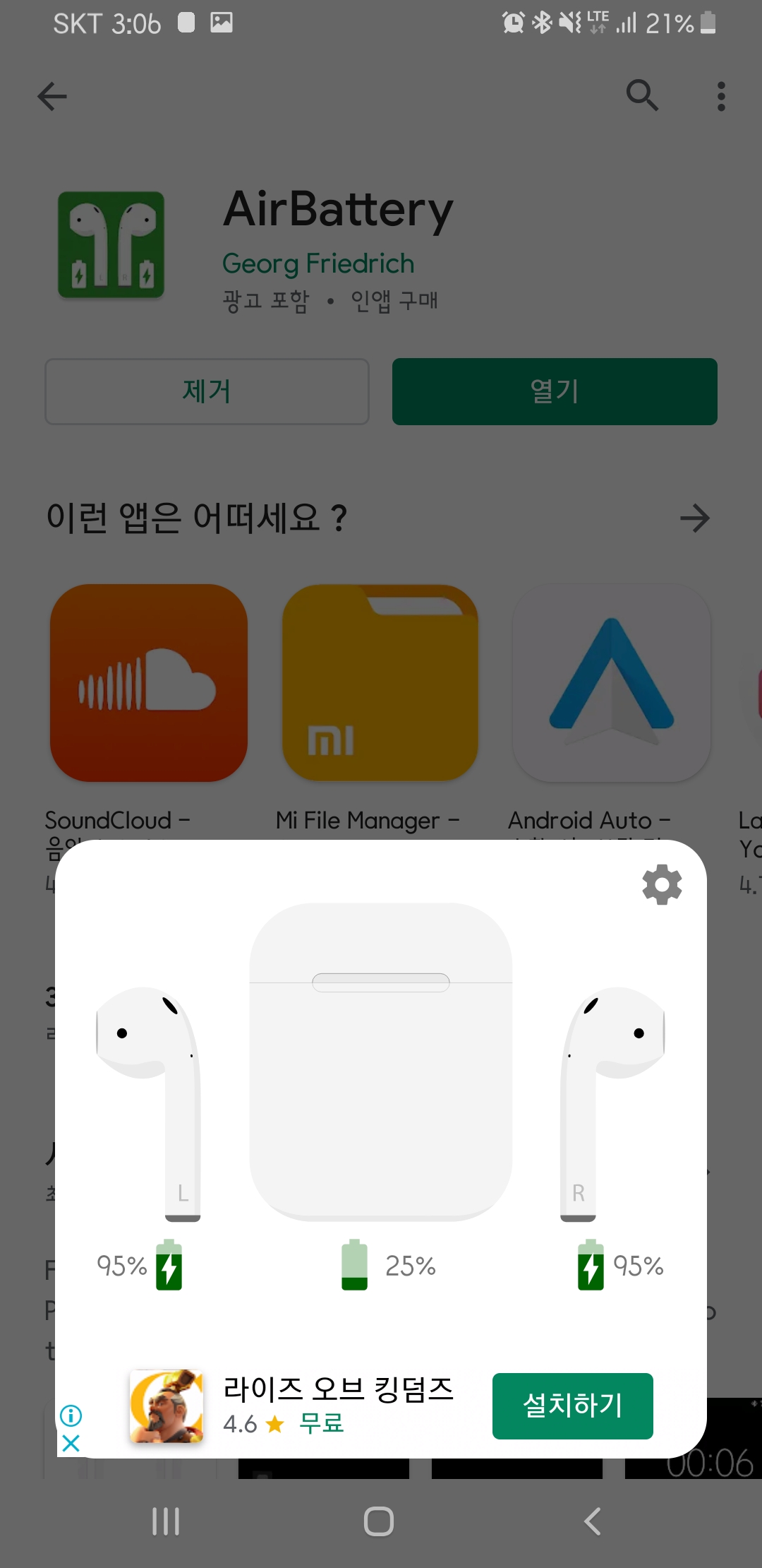안드로이드 스마트폰에서 에어팟 배터리 잔량을 보려면 어플 설치가 필요합니다. 그 중 AirBattery가 가장 다운로드 수가 많아 이 앱을 기준으로 설명하겠습니다. AirBattery는 무료이나 실시간 배터리 확인 및 광고 제거는 유료로 판매하고 있습니다.
