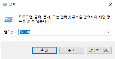 먼저, [Win + R]키를 눌러 실행창에서 dxdiag를 입력하여 확인을 눌러주세요.