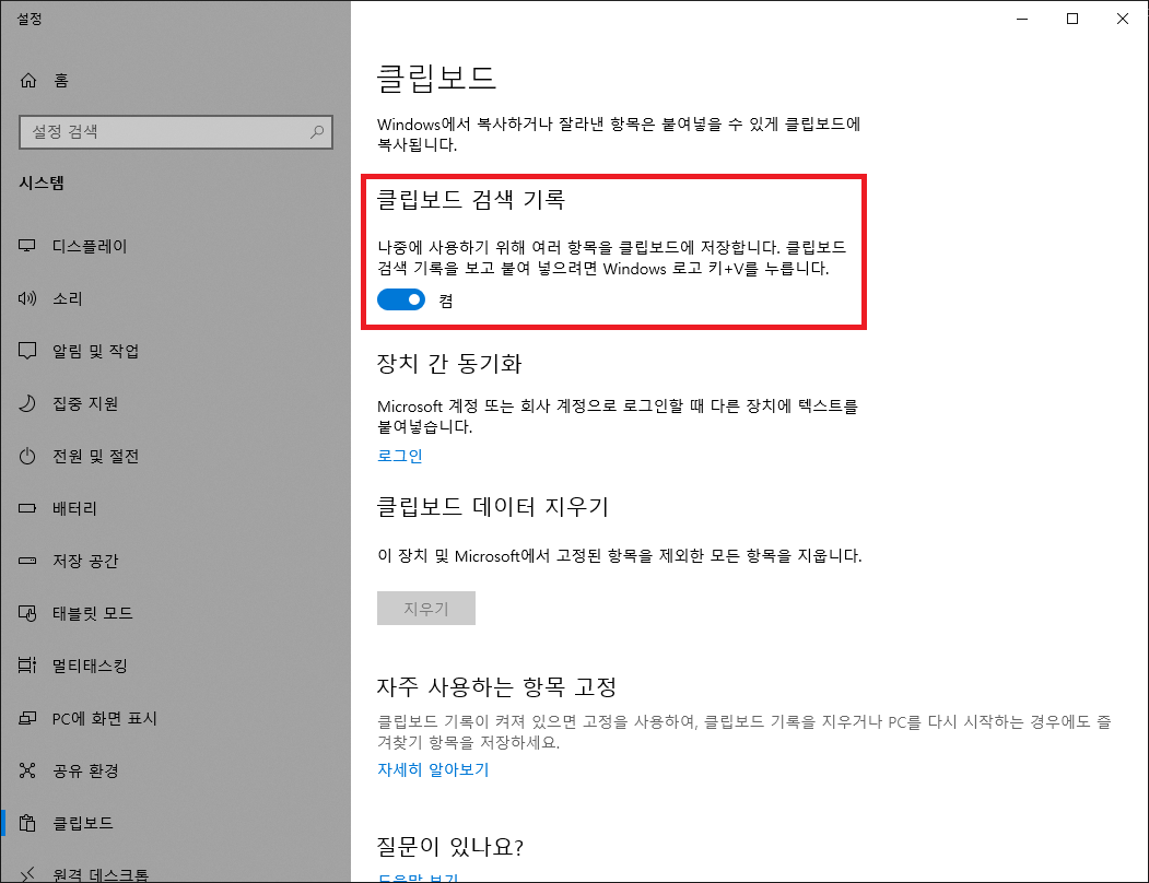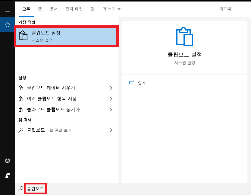 검색란에 클립보드를 입력하여 클립보드 설정 메뉴에 들어갑니다.
