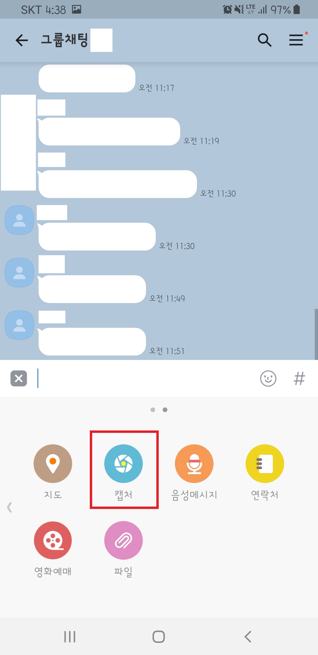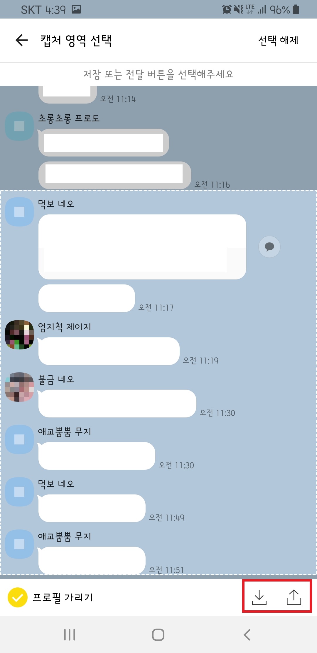 영역 지정 부분부터 채팅방 이름은 임의로 바뀌게 되며 프로필 사진 영역은 모자이크 처리가 되어있습니다.
