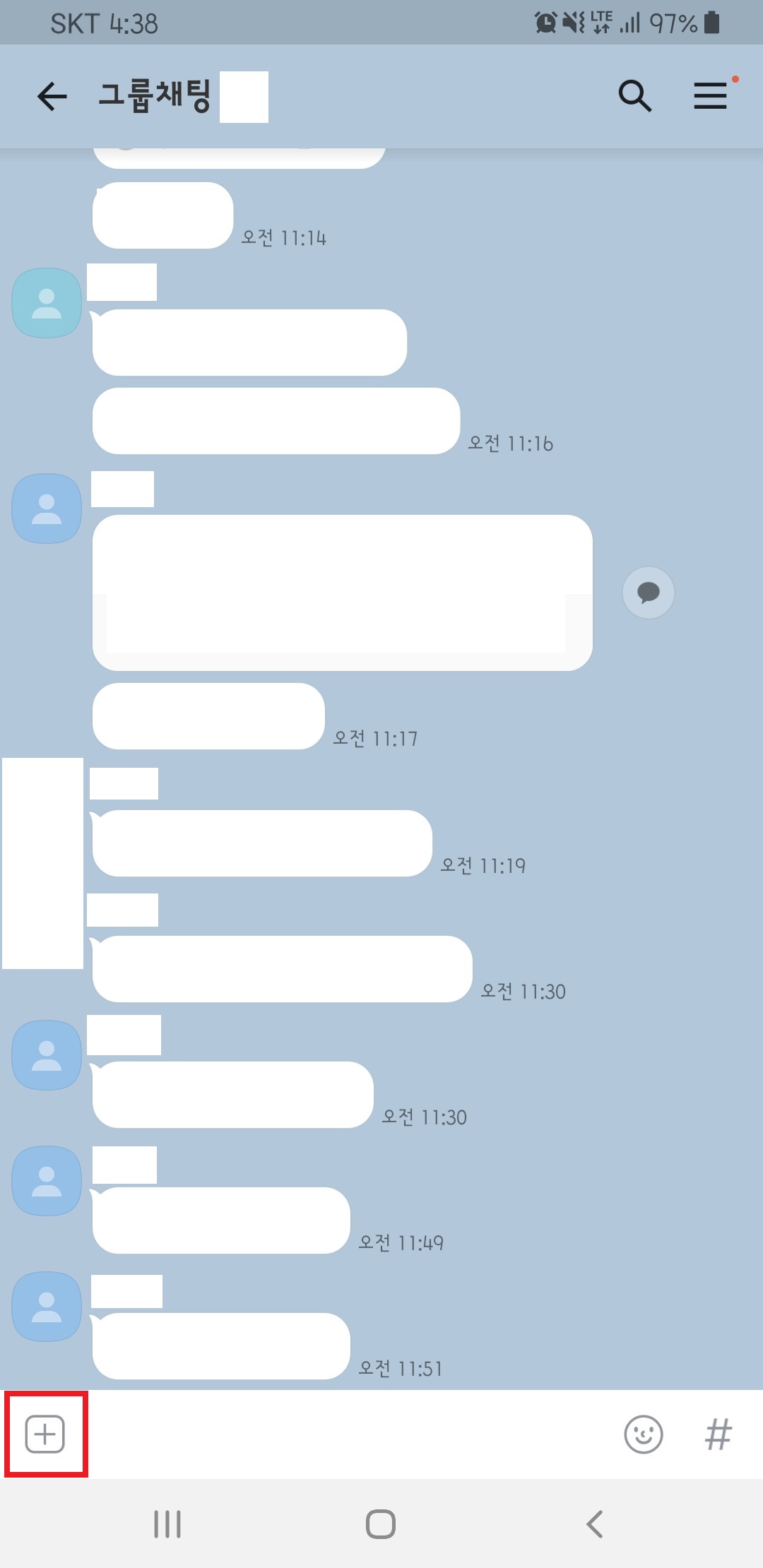 아래 사진처럼 채팅방에 들어간 후 좌측 하단 + 버튼을 터치합니다.