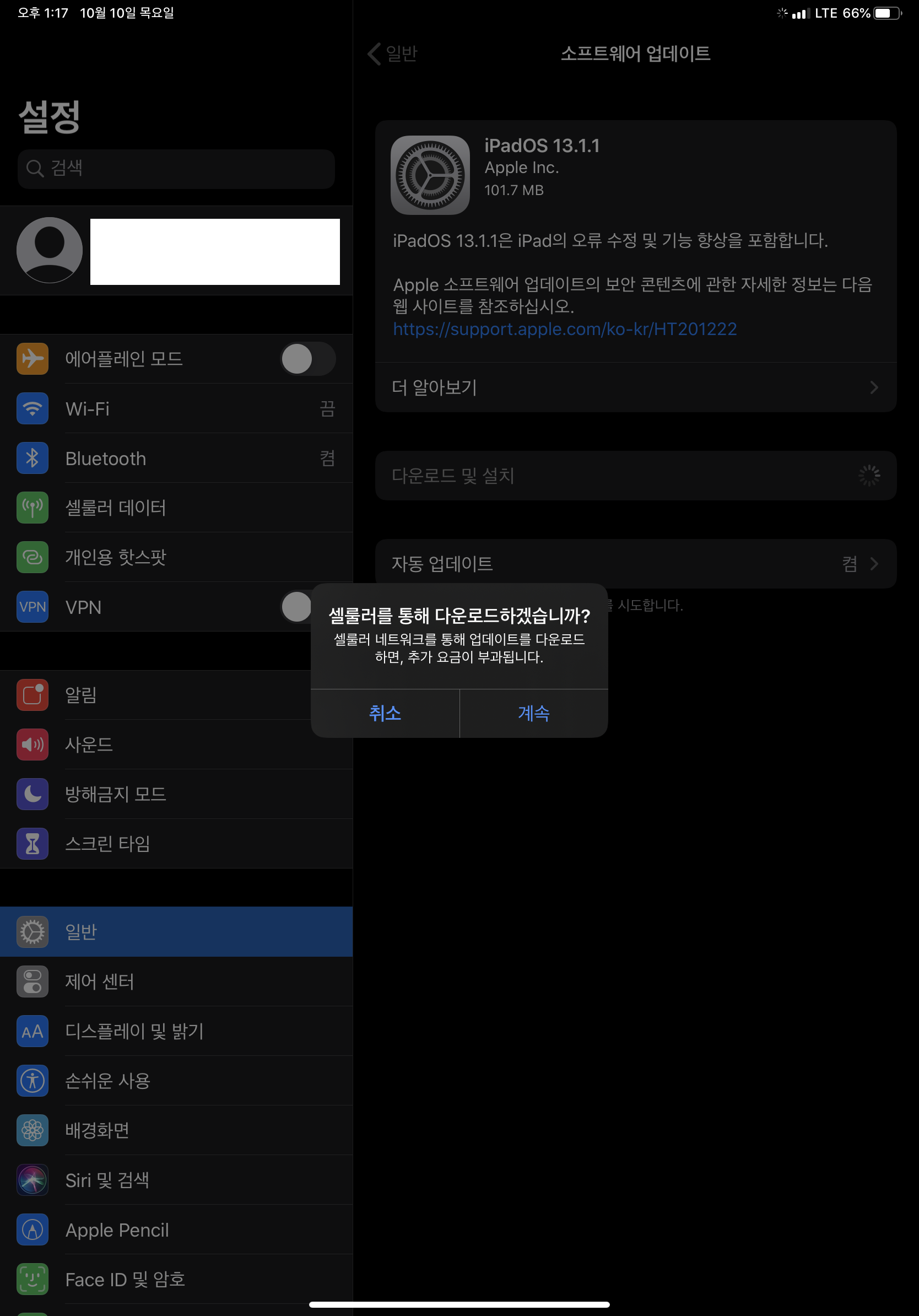 셀룰러 네트워크를 사용한다고 하여 경고창이 뜹니다. 계속 버튼을 누르면 됩니다.