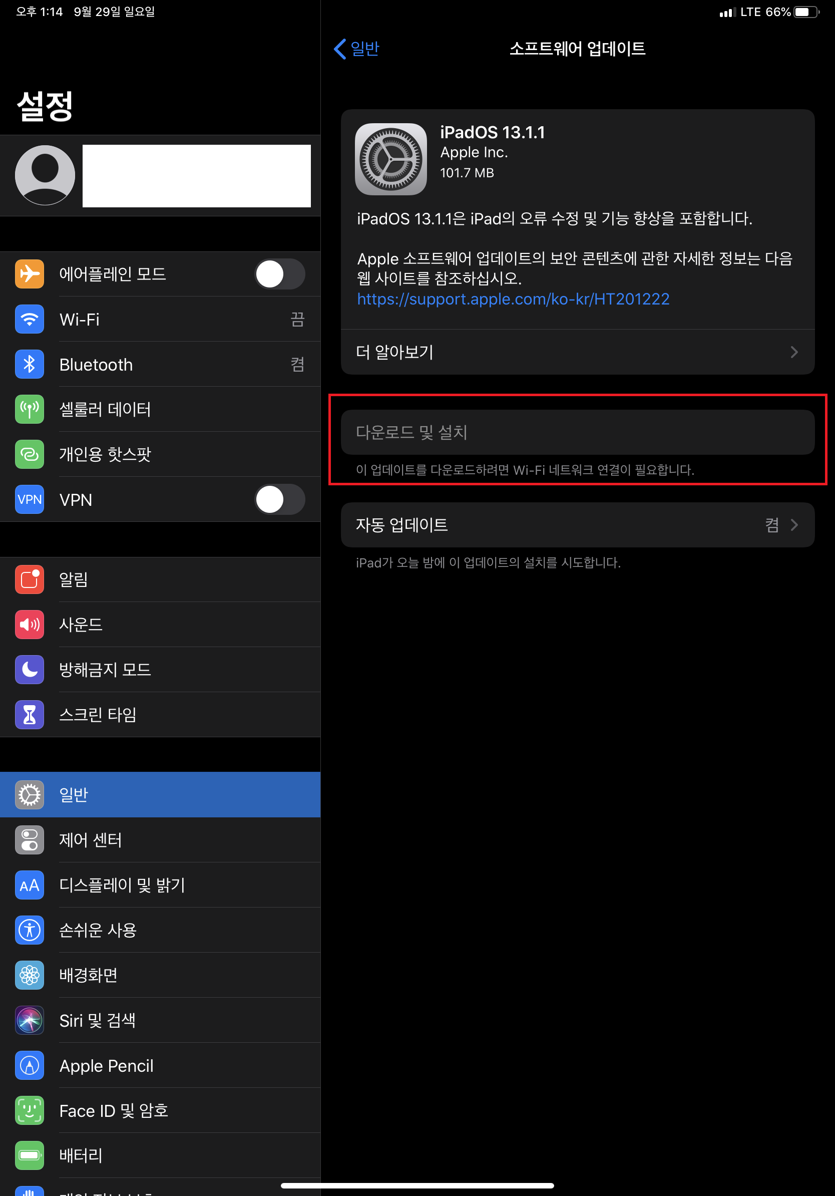 ios 13기준으로 ios업데이트 메뉴에 들어가면 '이 업데이트를 다운로드하려면 Wi-Fi 네트워크 연결이 필요합니다.'라는 문구가 있으면서 다운로드 및 설치 버튼이 비활성화되어 있습니다.
