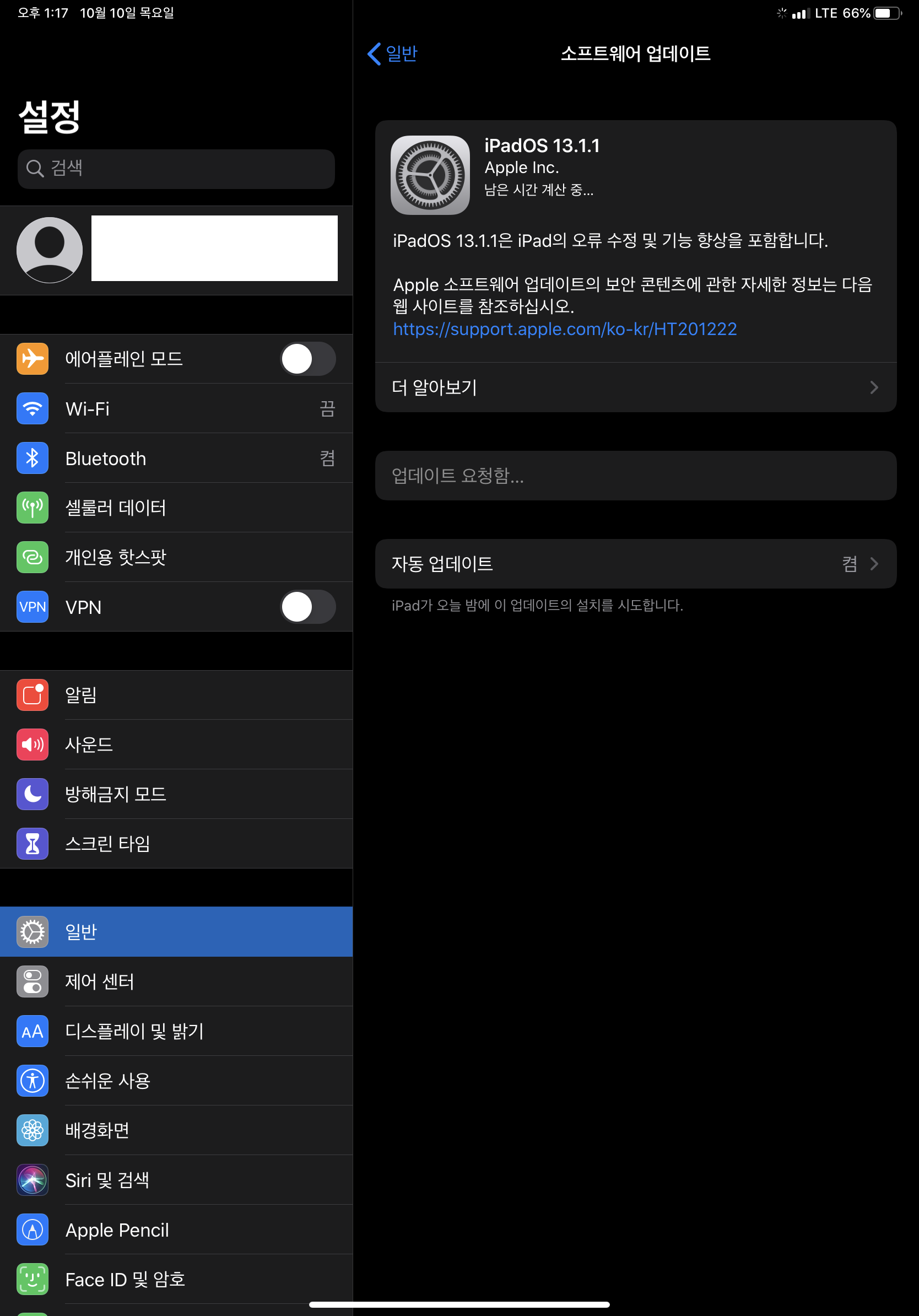 다시 ios 버전 업데이트 메뉴로 이동하면 다운로드 및 설치 버튼이 활성화 되어있습니다. 버튼을 눌러 업데이트를 진행합니다.