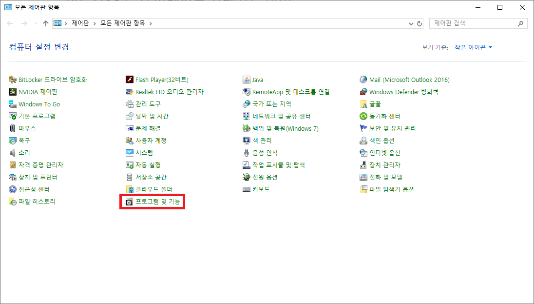 먼저, 설치된 업데이트를 삭제하기 위해 제어판에 들어간 후 프로그램 및 기능을 클릭합니다.
