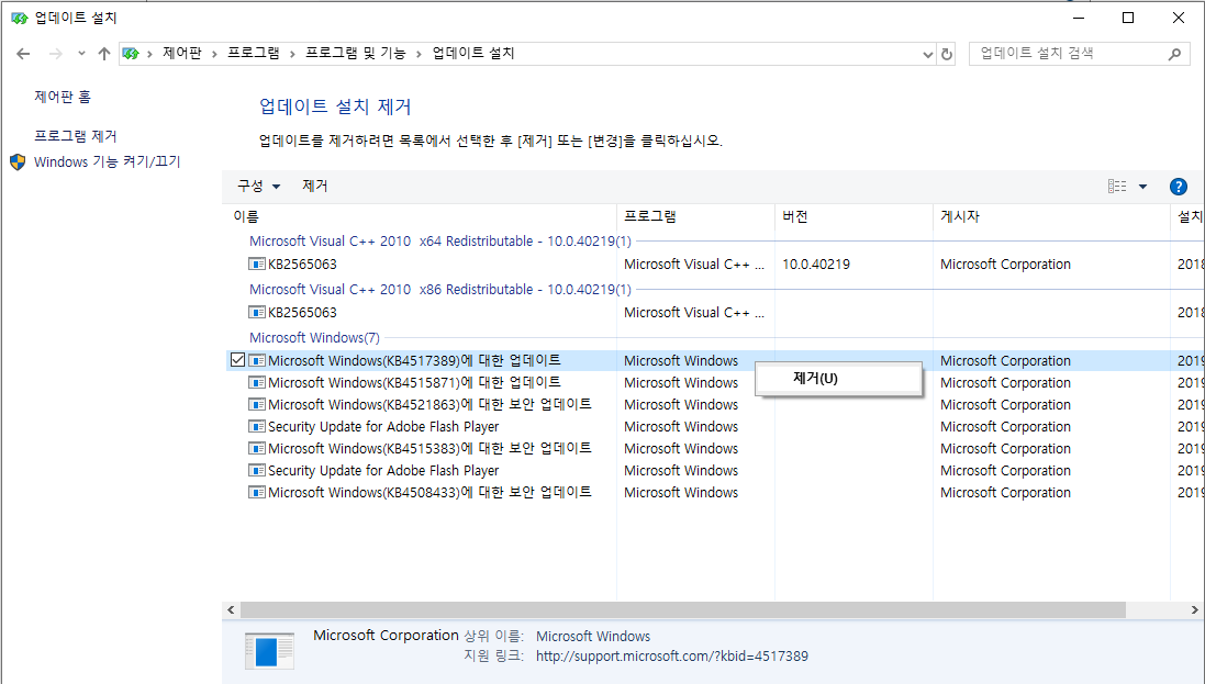 이제 삭제하고자 하는 업데이트에 마우스 우클릭을 하여 제거를 선택하면 됩니다.