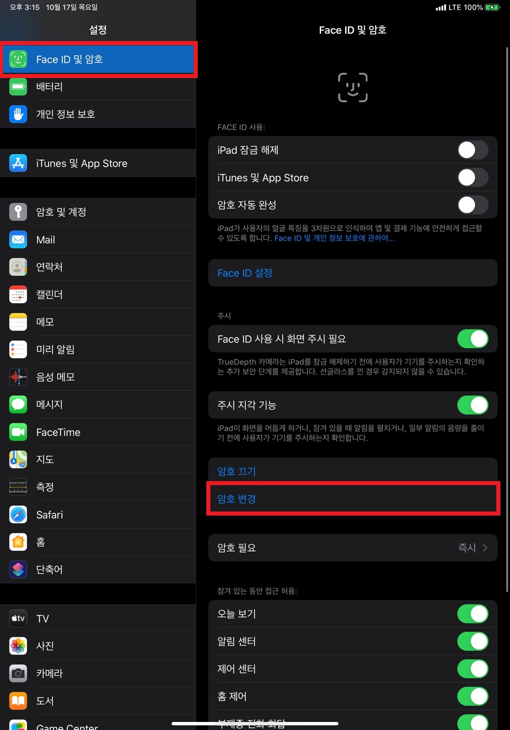 6자리로 설정된 비밀번호를 4자리로 변경하기 위해 설정 - Face ID 및 암호 - 암호 변경에 들어갑니다.