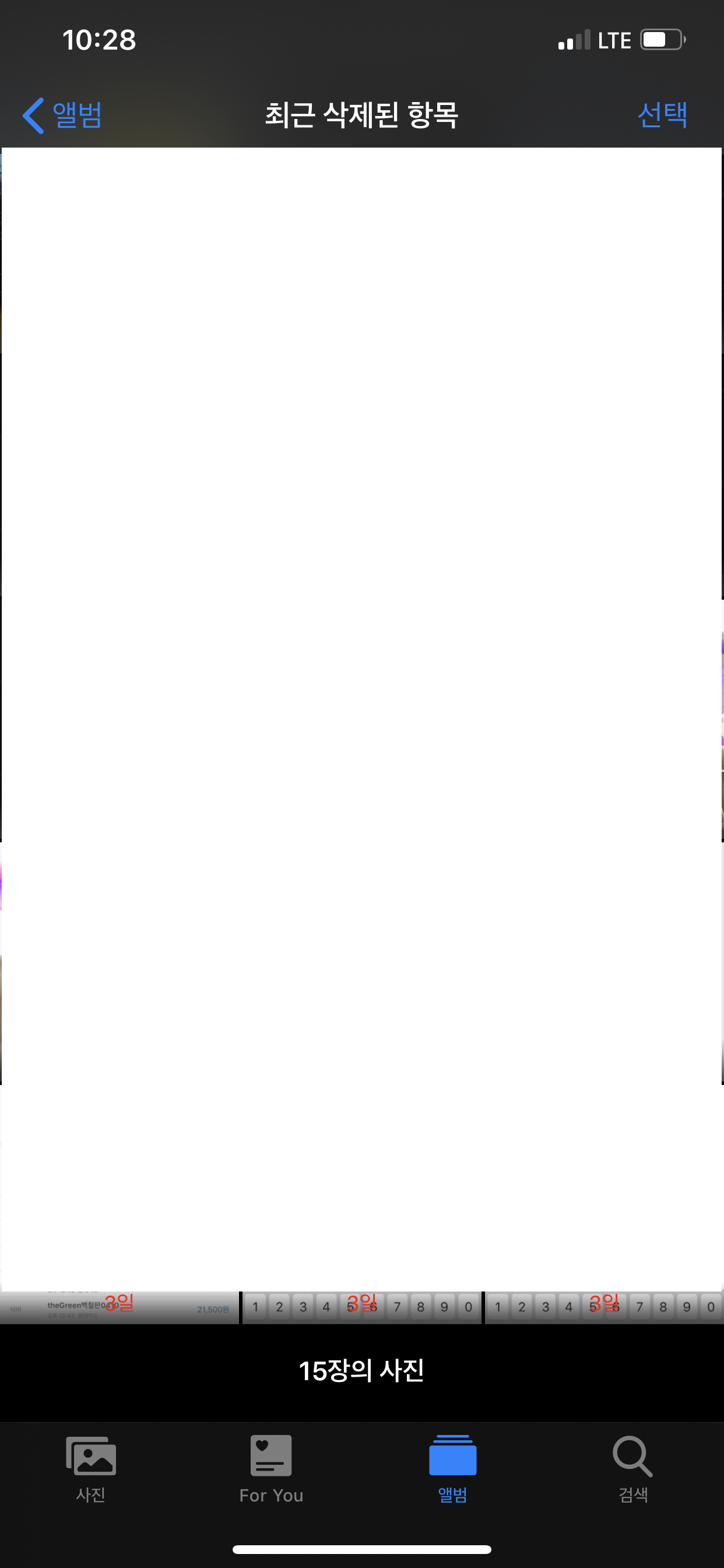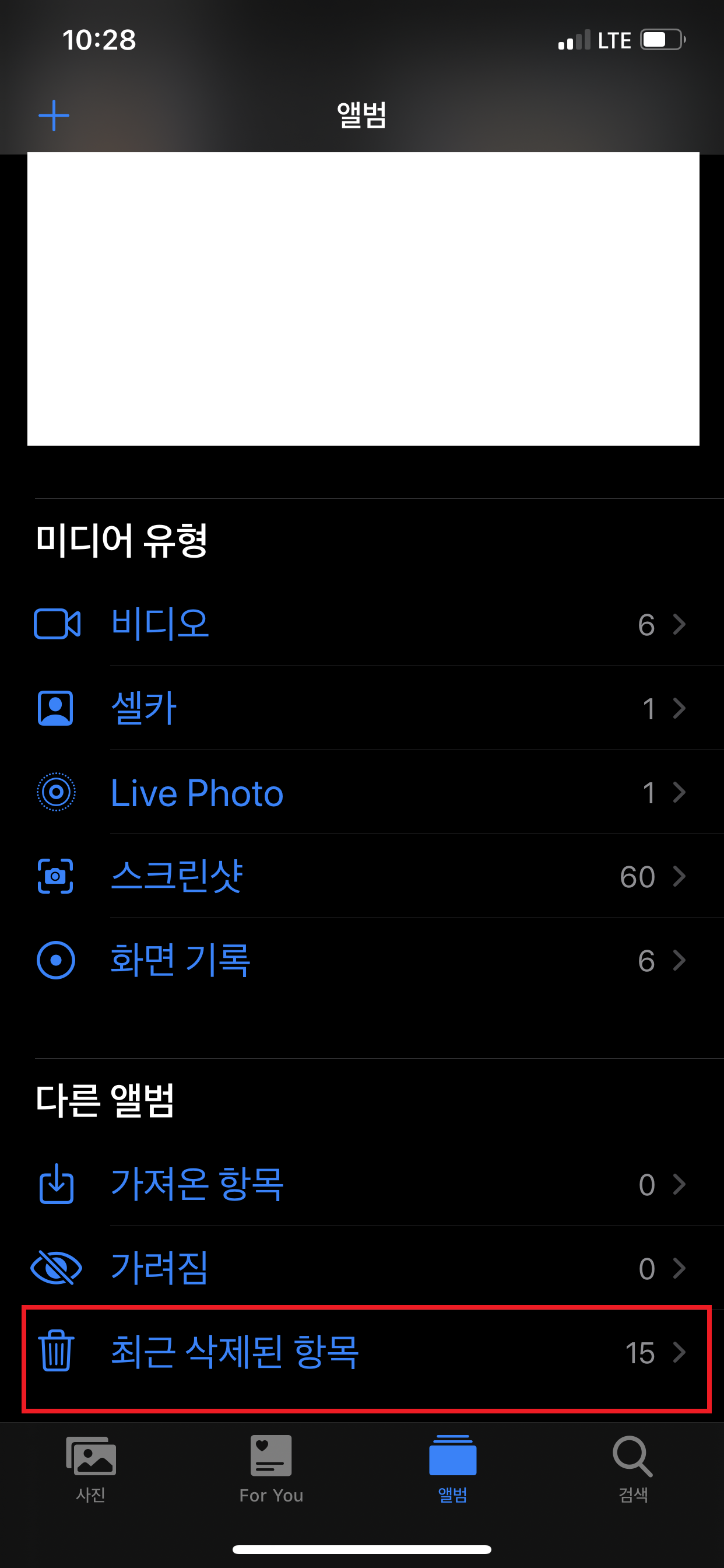 아이폰 기본 앨범 앱에 들어가면 하단에 최근 삭제된 항목이 있습니다.