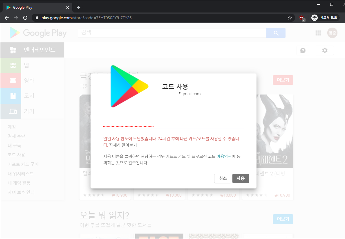 그런데, 구글 기프트카드 코드를 입력했을 때 '일일 사용 한도에 도달했습니다. 24시간 후에 다른카드/코드를 사용할 수 있습니다.'