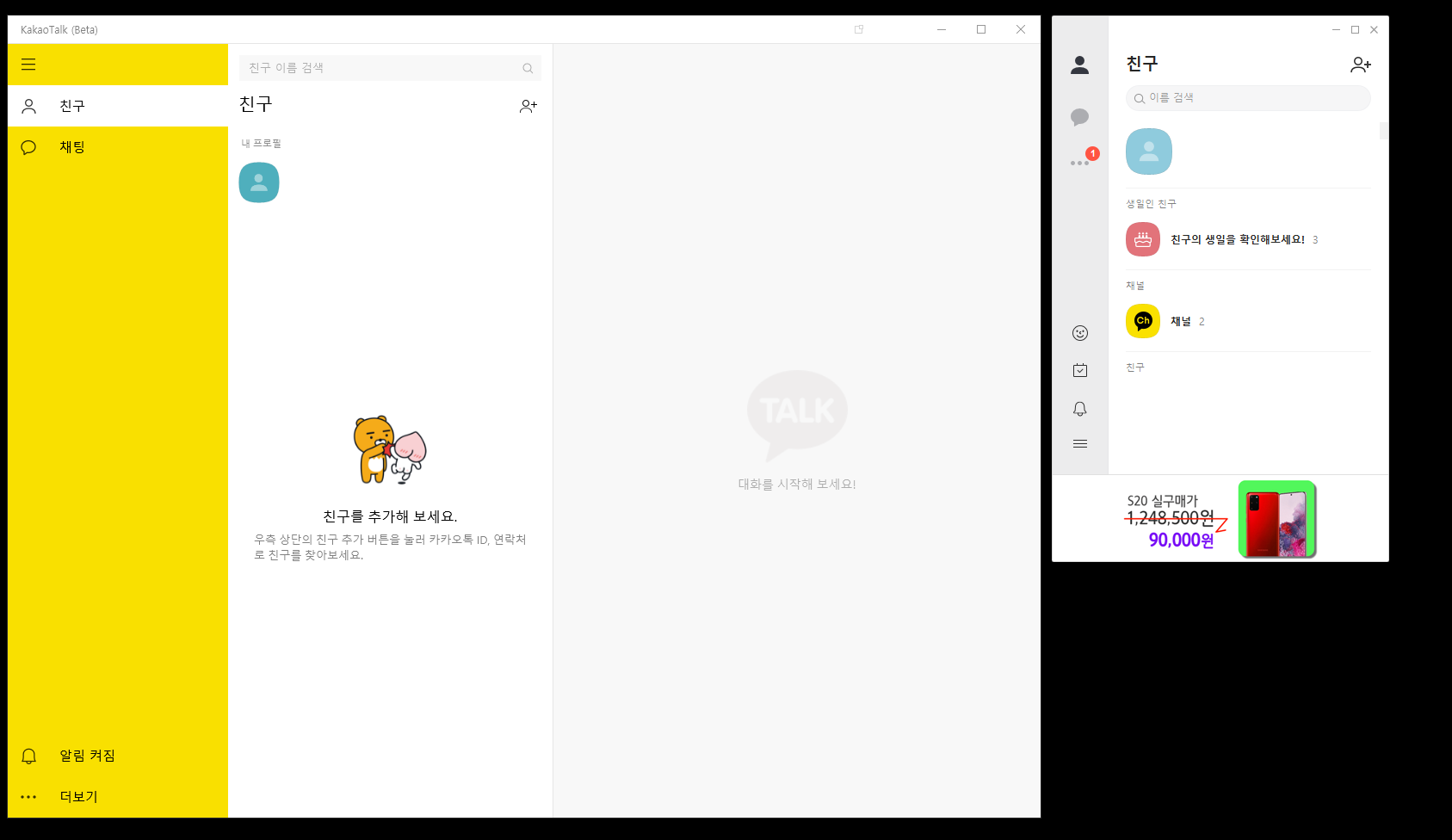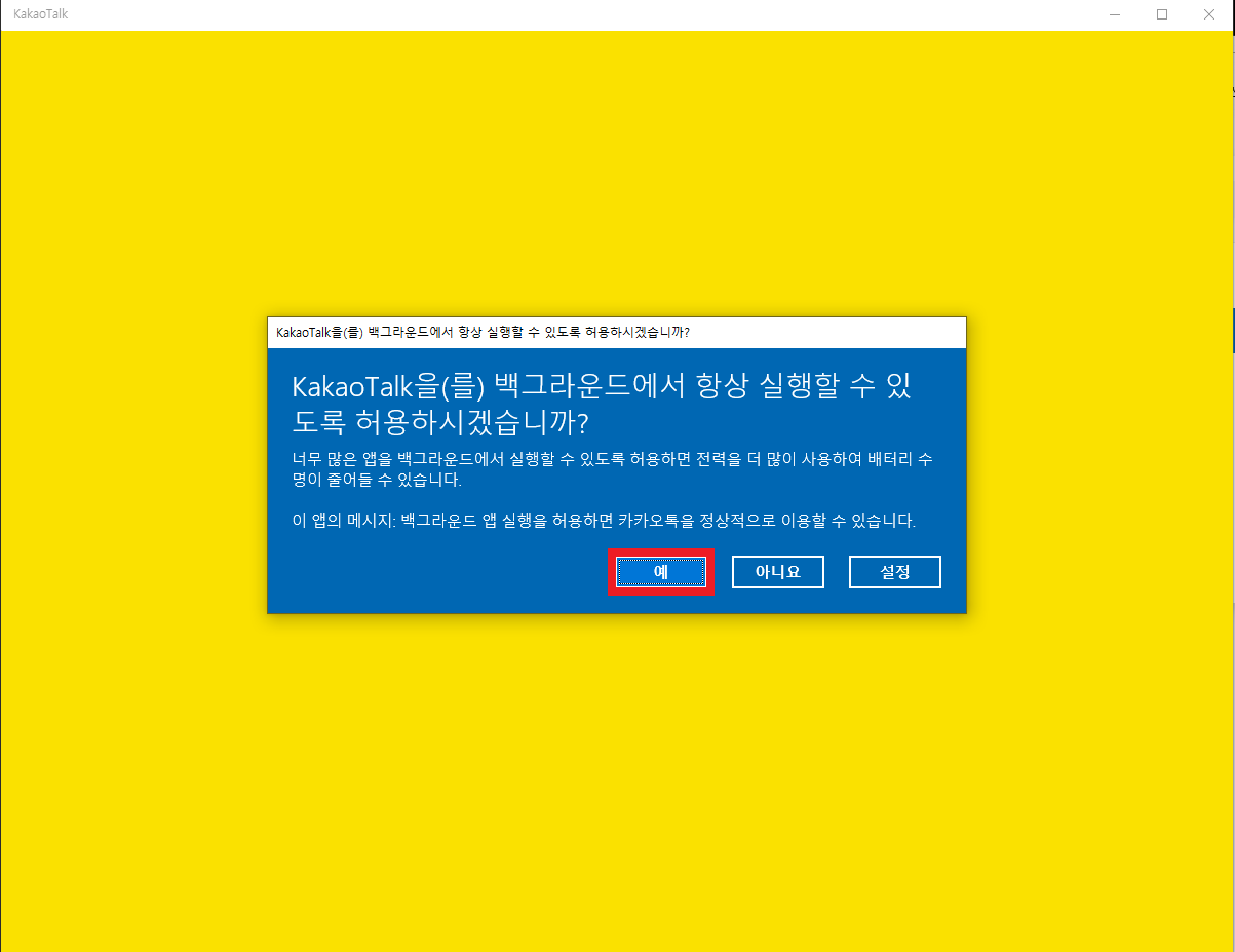 설치가 완료되어 실행하면 원래 알고있던 카카오톡과는 조금 다른 걸 느낄 수 있으며, 백그라운드 항상 실행을 허용해줍니다.