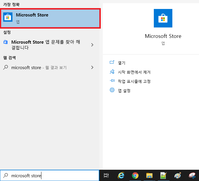 먼저, 검색창에 microsoft store를 입력하여 실행합니다.