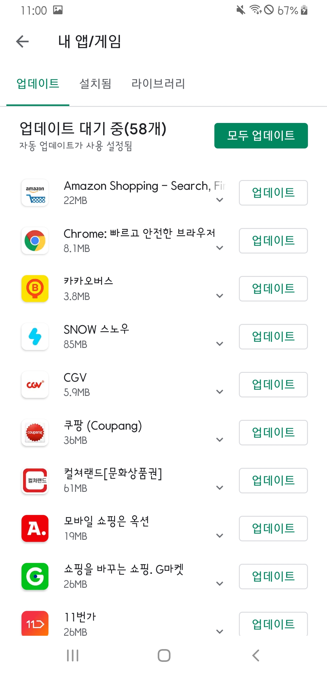 Play 스토어 종료 후 업데이트에 다시 가면 업데이트 할 수 있도록 변경이 된 것을 확인할 수 있습니다.