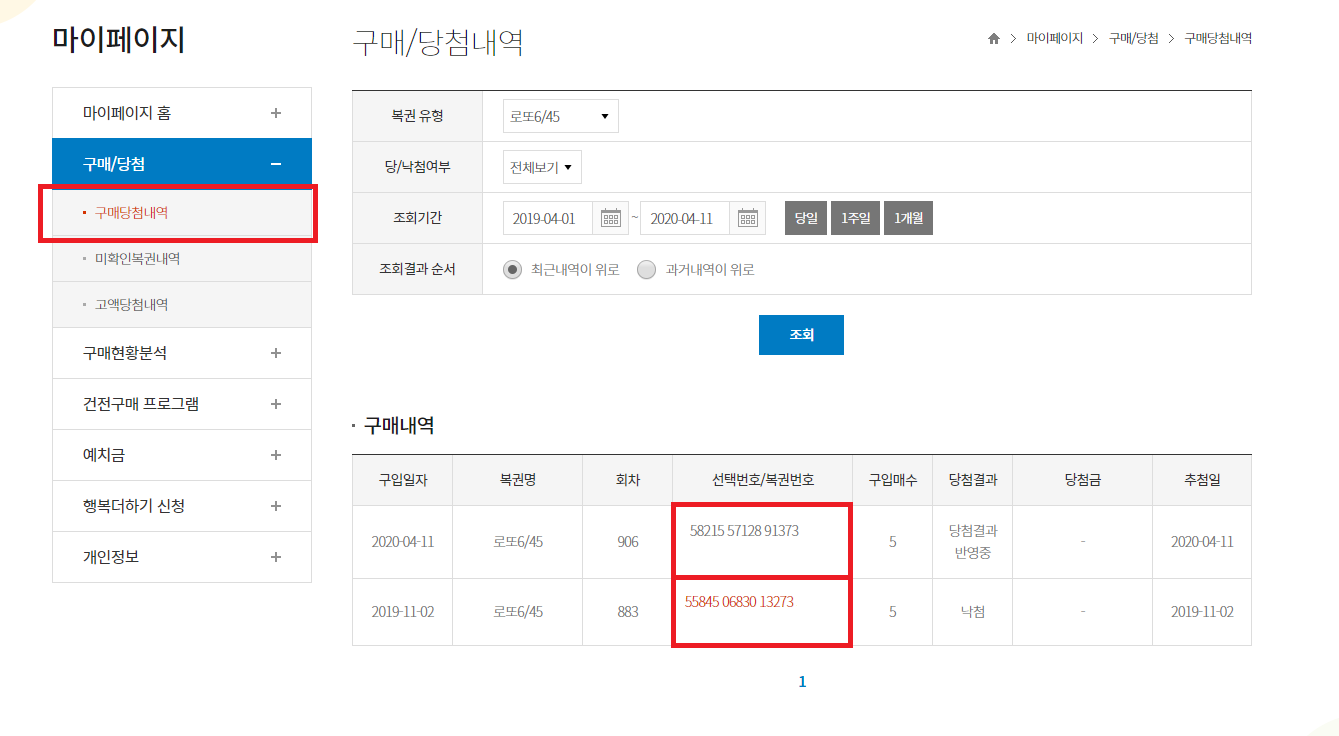 (구매내역은 동행복권 사이트 마이페이지 - 구매/당첨 - 구매당첨내역에서 조회 가능.)