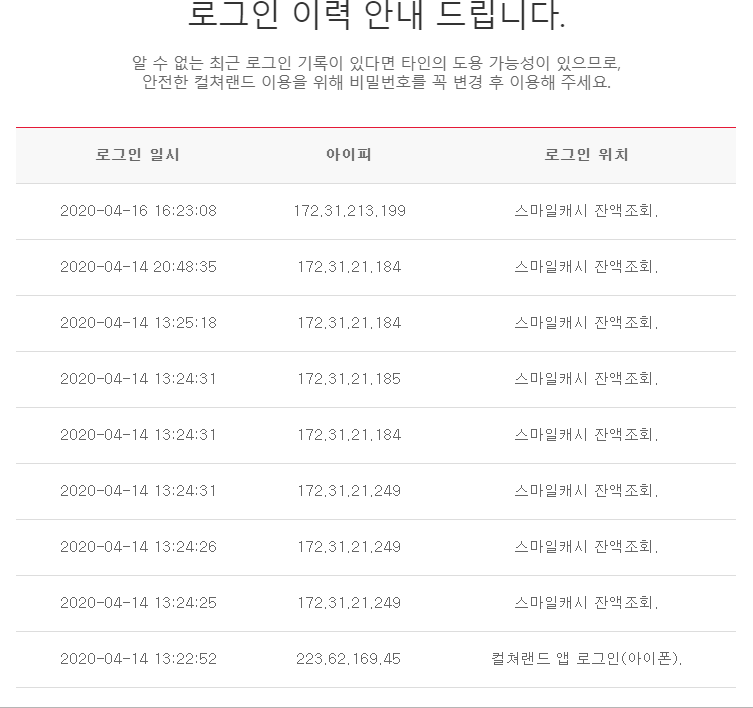컬쳐랜드를 따로 로그인 한적이 없었는데 로그인 이력 관련 메일을 받아 걱정이 되었습니다. 컬쳐랜드 계정의 경우 수십만 캐쉬가 충전되어 있기 때문에 해킹을 당한다면 타격이 크기 때문이죠.