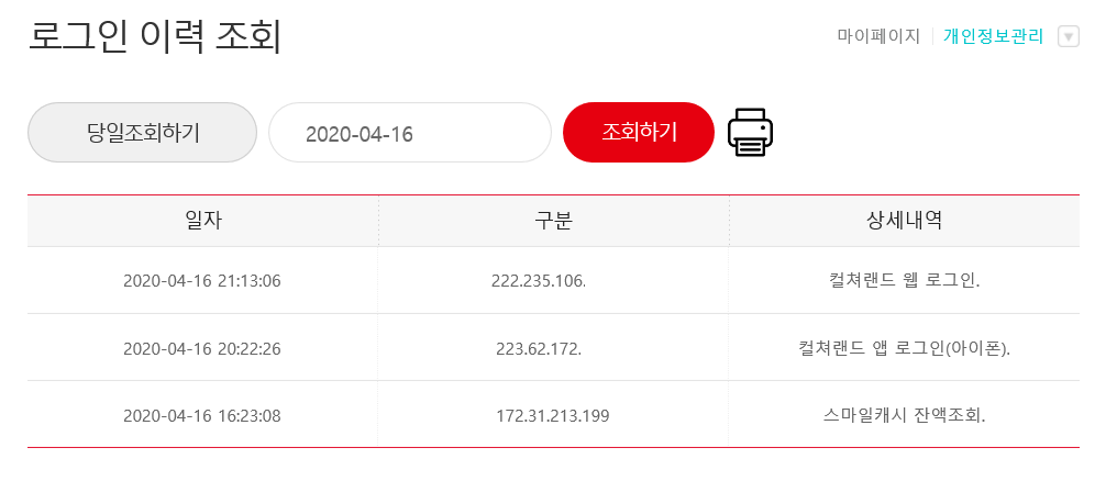 로그인 기록을 실시간으로 확인하기 위해 컬쳐랜드 - 마이페이지에 들어왔습니다.