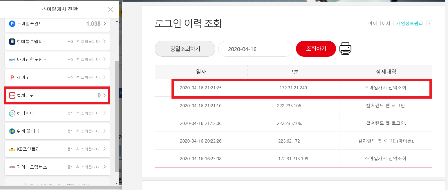 컬쳐랜드 로그인 이력 안내메일 스마일 캐시 잔액조회는?