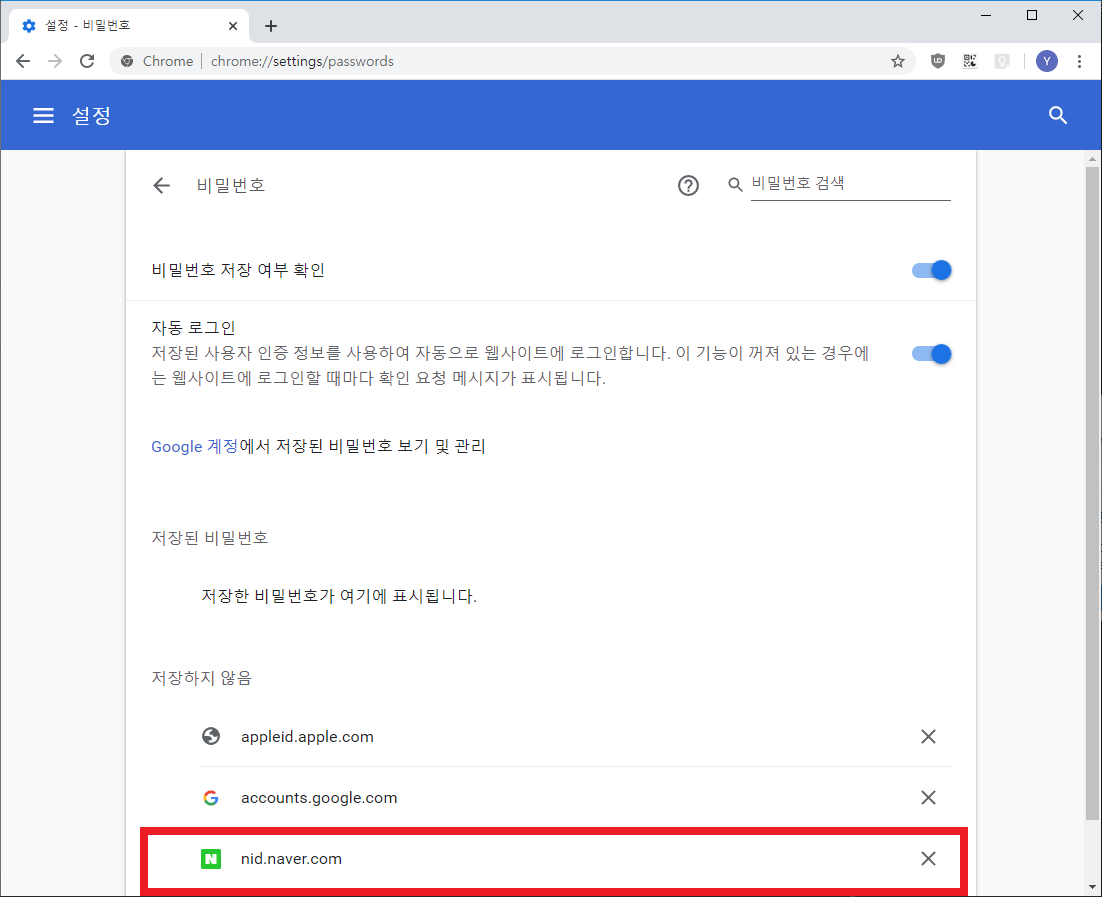 이 화면에서 저장하지 않음 영역에 비밀번호 저장 기능이 꺼져 있는 사이트들을 볼 수 있으며 다시 사용하고 싶은 사이트에 대해 X를 눌러 제거해주면 다음 로그인할 때 비밀번호를 저장할 건지 다시 물어보게 됩니다.