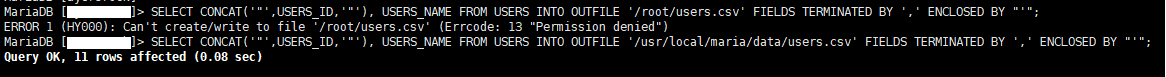 SELECT USERS_ID, USERS_NAME FROM USERS INTO OUTFILE '/usr/local/maria/data/users.csv' FIELDS TERMINATED BY ',' ENCLOSED BY "'";
