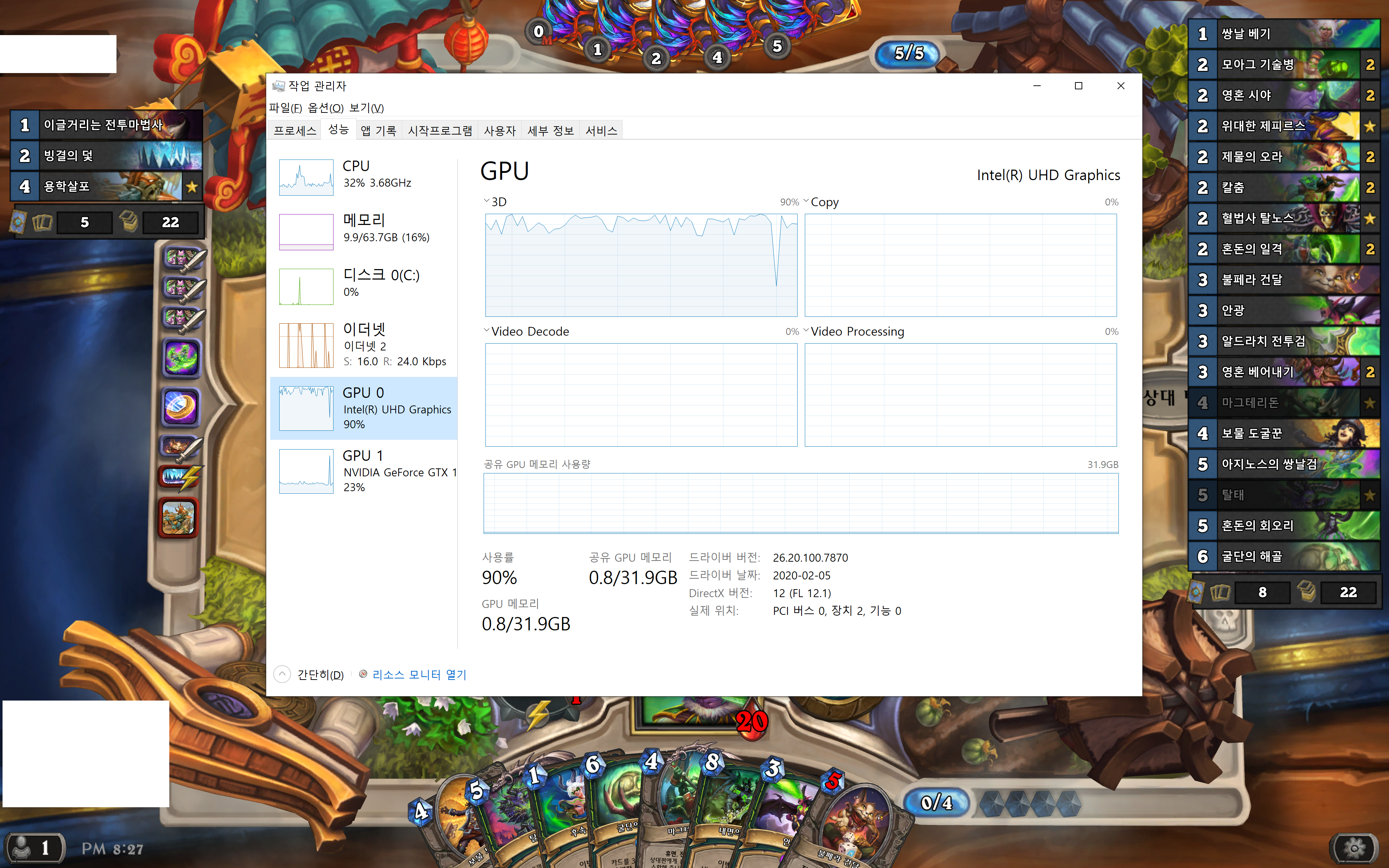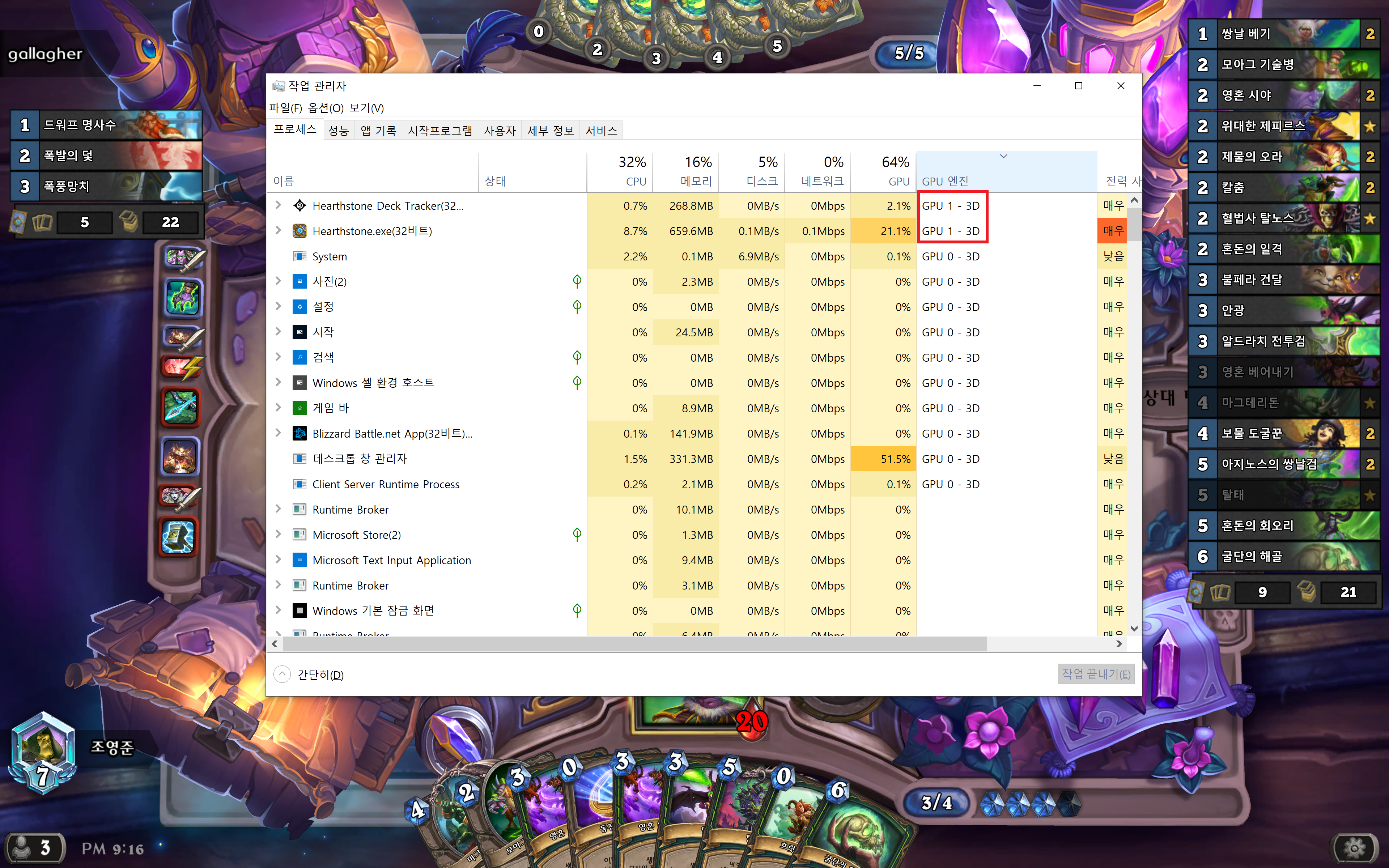 작업관리자에서 해당 프로그램이 어떤 GPU 엔진을 사용하고 있는지 알 수 있습니다. 아래 사진처럼 하스스톤 게임은 GPU 1, 이외 나머지 프로그램의 경우 GPU 0을 사용하는 것을 볼 수 있습니다. 따라서 고성능 작업을 안할 때는 전력을 아끼기 위해 GPU 0만 사용하는 것이죠. (GPU 0은 내장 그래픽, GPU 1은 외장 그래픽입니다.)